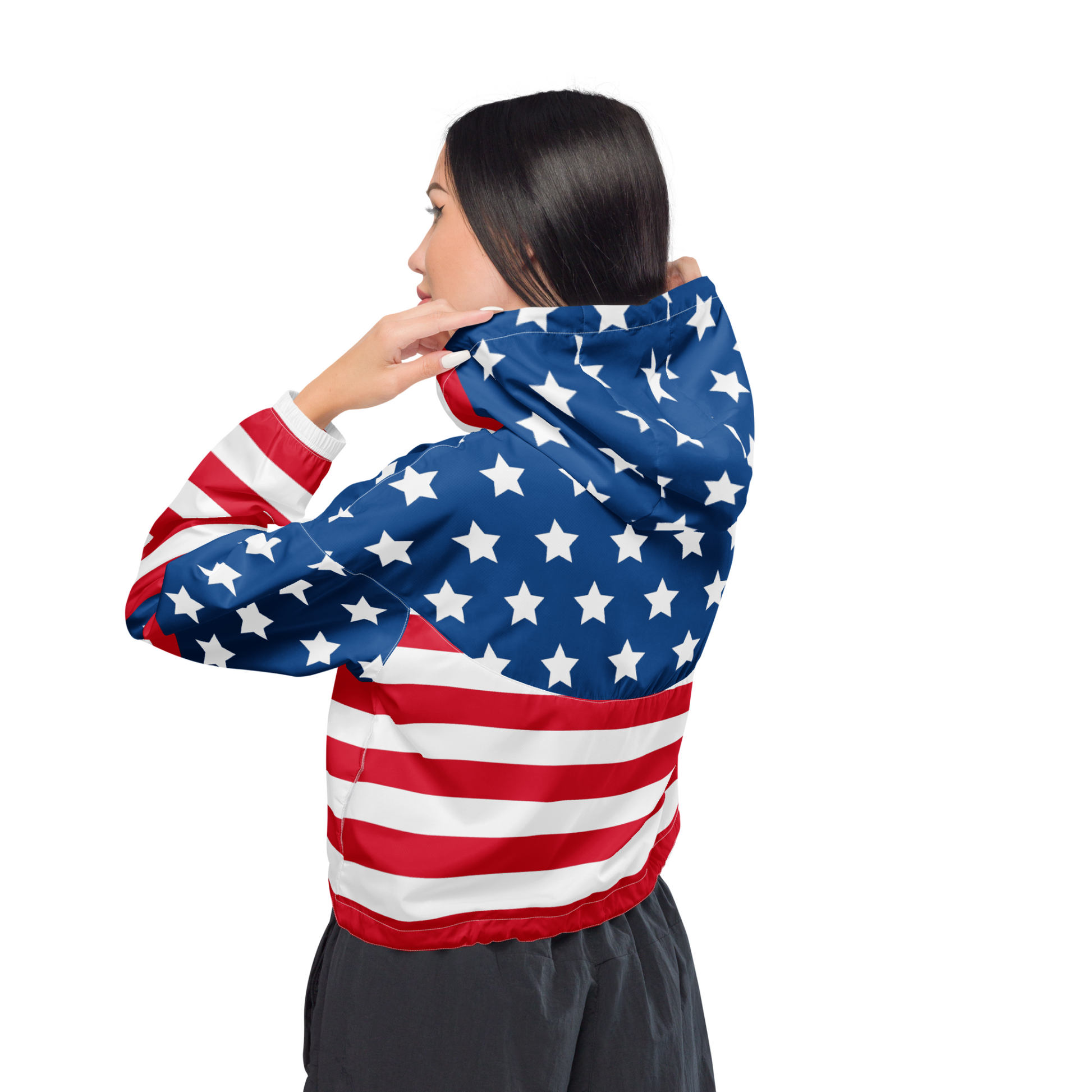 Whether you're hiking, camping, or simply enjoying a festive gathering, this versatile cropped hoodie has you covered. The iconic American flag design proudly displayed on this windbreaker will make you stand out from the crowd, and the adjustable drawcords on the hood and waist ensure a perfect fit. It's the ideal girlfriend gift or a treat for yourself. Get ready to turn heads and inspire awe with this long sleeve crop top.